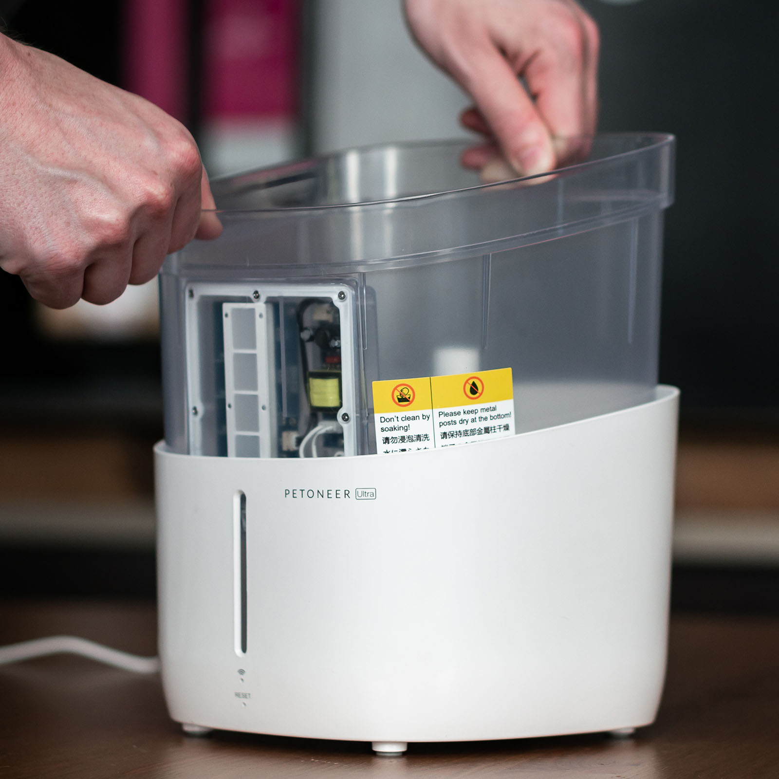 Petoneer Fresco Ultra пропускает воду через трехступенчатый фильтр, в который входит сетка для крупных фрагментов мусора, угольный слой и ионообменная смола. Это очищает жидкость от частиц мусора, хлора, органики, а также от солей жесткости. Сменный фильтр рассчитан на 30 дней работы. Установленная внутри ультрафиолетовая лампа дополнительно обеззараживает воду.